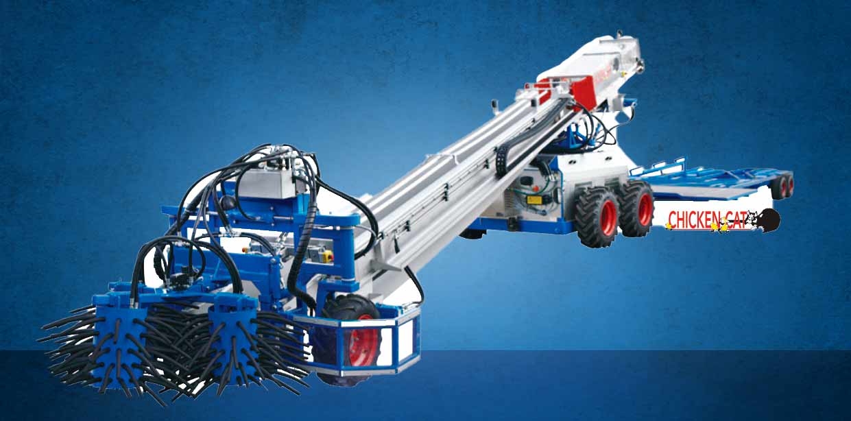 La superficie de los tambores está cubierta con dedos de goma largos y flexibles que levantan los pollos muy suavemente hacia el colector y luego hacia el transportador.