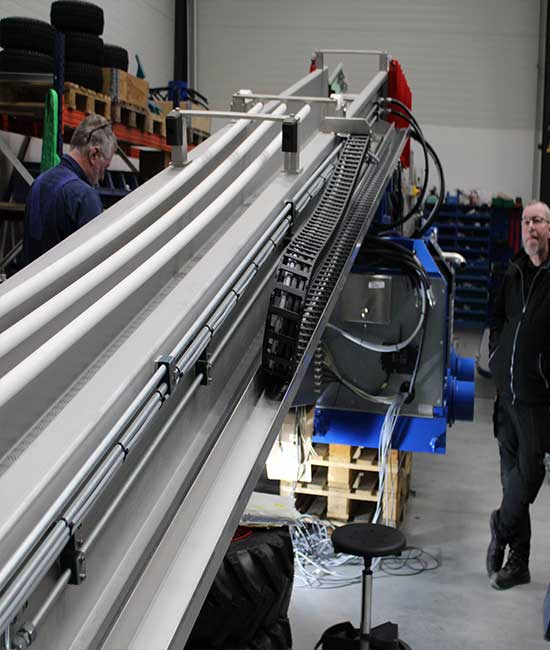 La estructura principal de la máquina consta de un sistema de cabezal colector, accionado por medios hidráulicos. El transportador es ajustable hasta 21 o 24 metros y la unidad central viene con tracción en las cuatro ruedas.