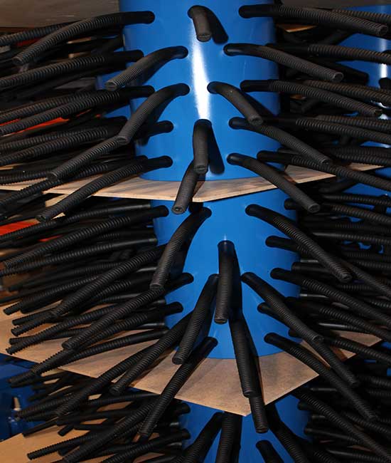 La superficie de los tambores está cubierta con dedos de goma largos y flexibles que levantan los pollos muy suavemente hacia el colector y luego hacia el transportador.