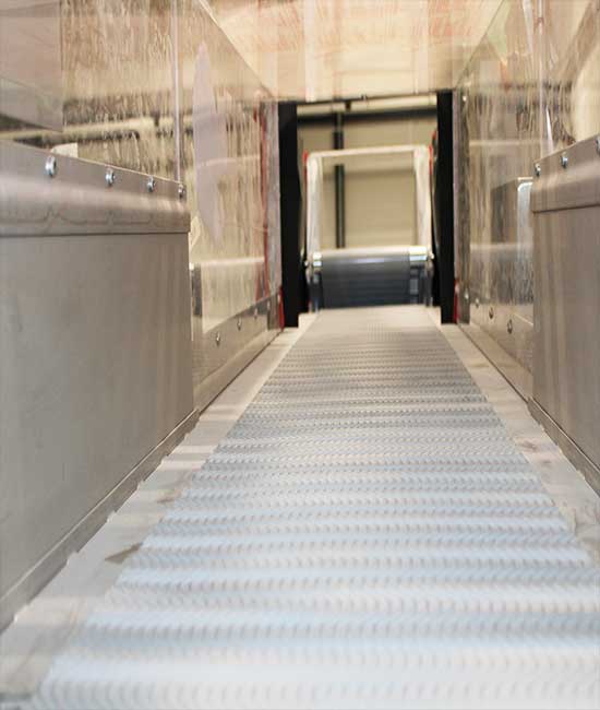 La cinta transportadora es muy flexible en el sentido de que se adapta a muchos tipos diferentes de contenedores como Linco Load, Maxi Load, Storck System, Anglia Autoflow y Larco.